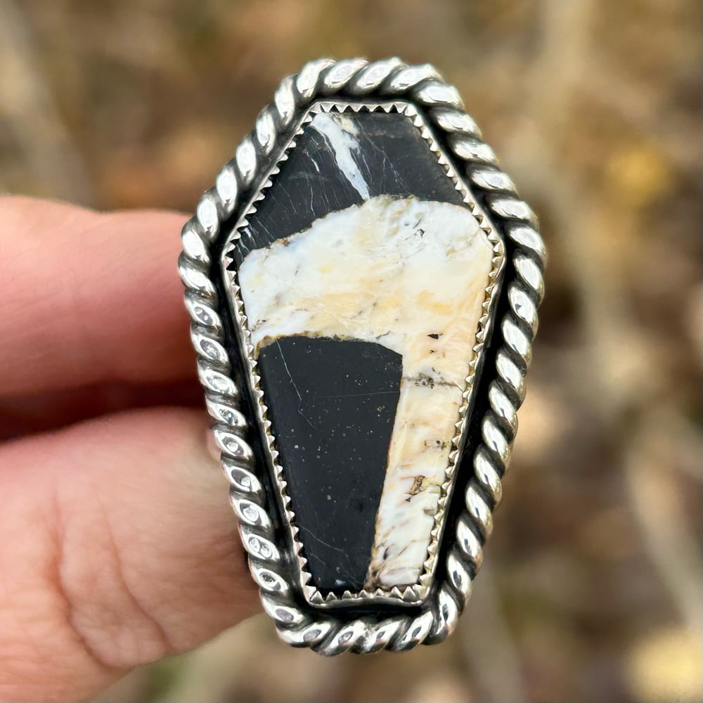 Gorgeous high contrast White Buffalo Turquoise in a coffin shape! Details include a serrated bezel and a twist wire border. Ring has a double split shank style band for comfort and wearability. Backplate is stamped with artist initials (my own) and ".925" for Sterling.