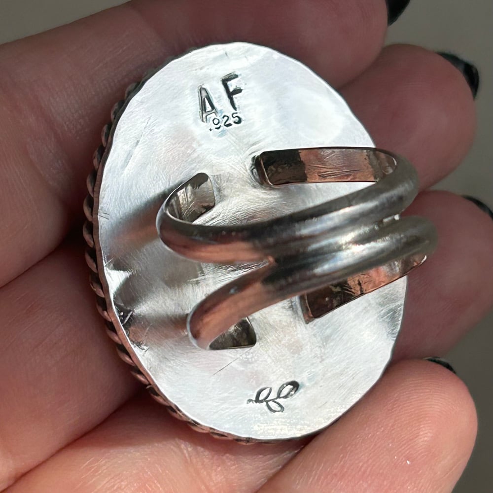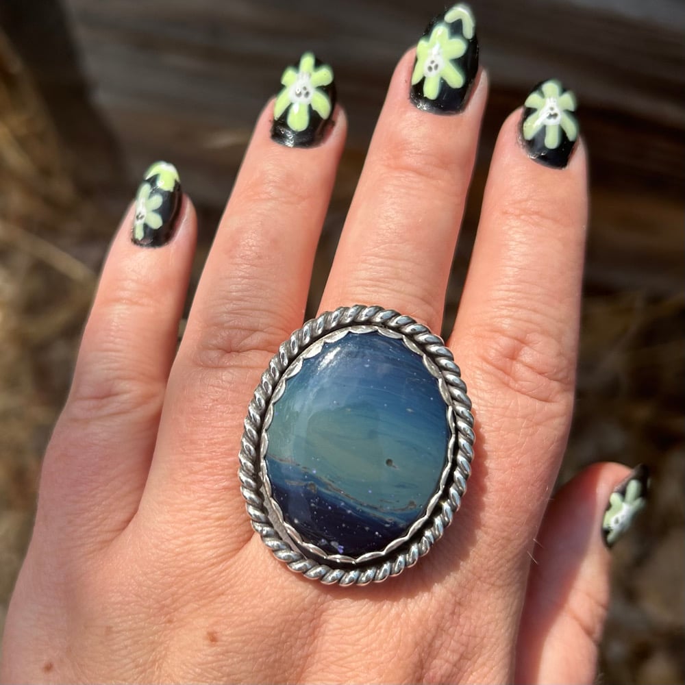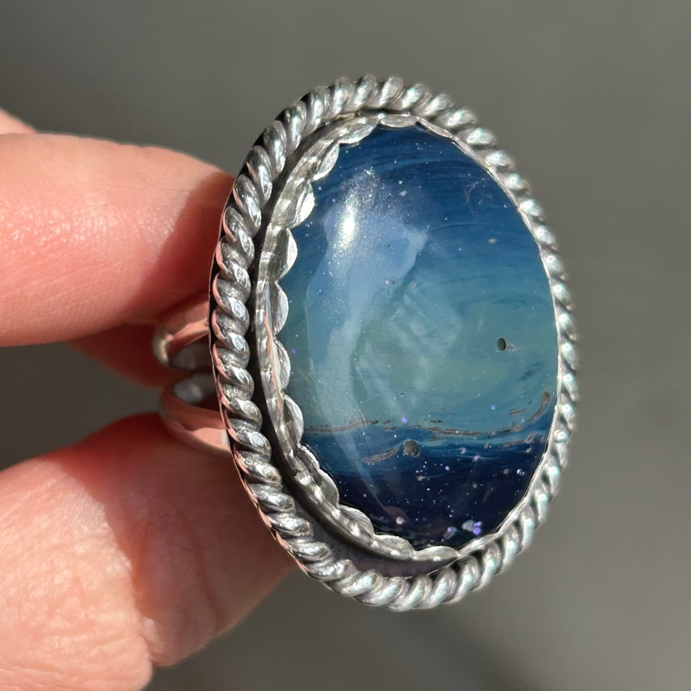 Beautiful oval, moody Leland Blue set in handmade Sterling Silver ring. Details include a scalloped bezel and a twist wire border. Ring has a double split shank style band for comfort and wearability. Backplate is stamped with artist initials (my own) and “.925” for Sterling.