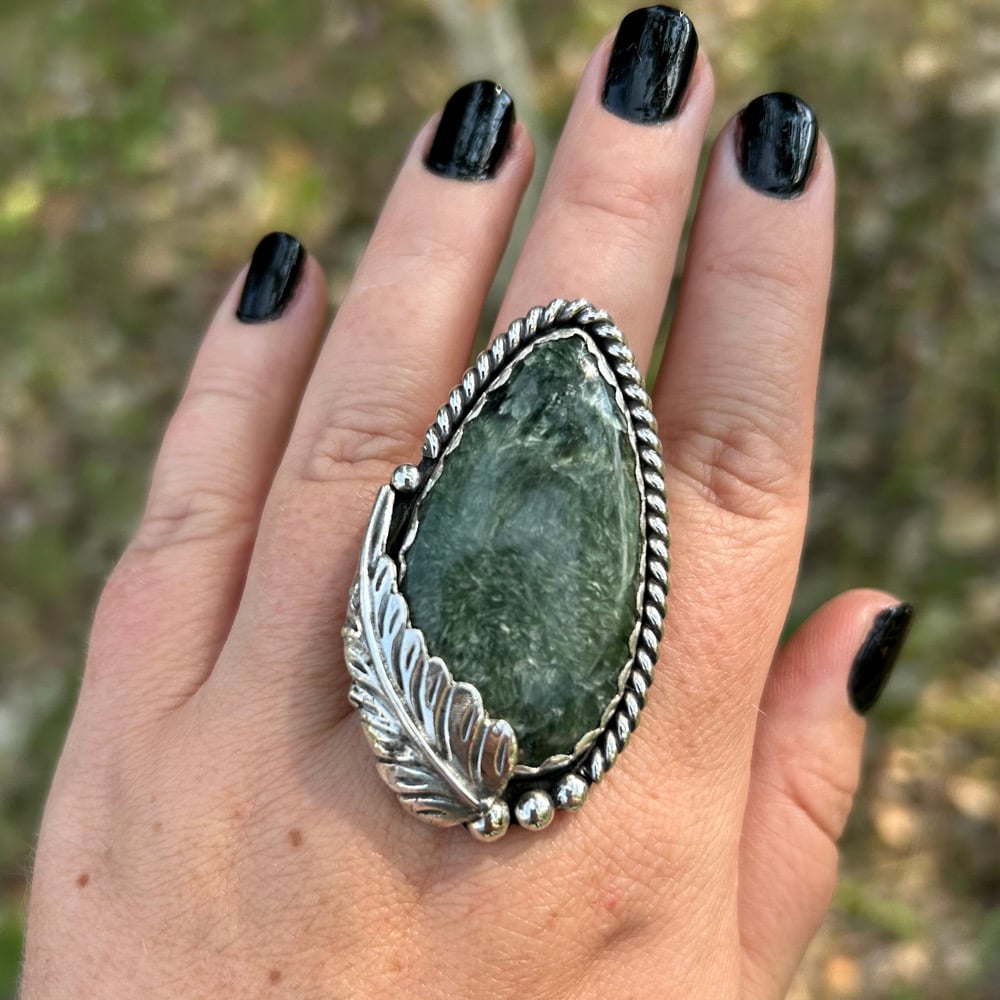 Deep green Seraphinite set in handmade Sterling Silver statement ring! Details include a scalloped bezel, large feather/leaf, silver balls, and a thick twist wire border. Ring has a stamped triple split shank style band for comfort and wearability. Backplate is stamped with artist initials (my own) and “.925” for Sterling.
