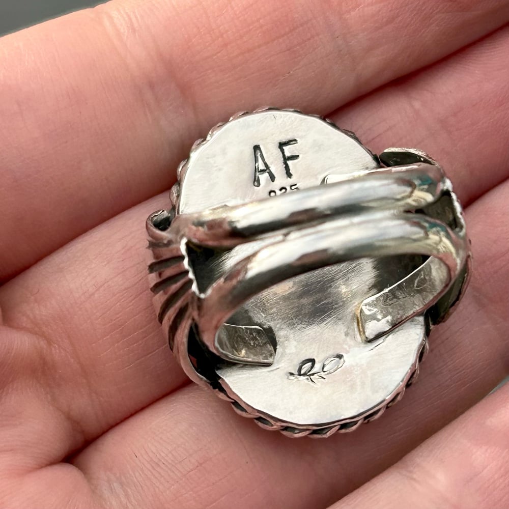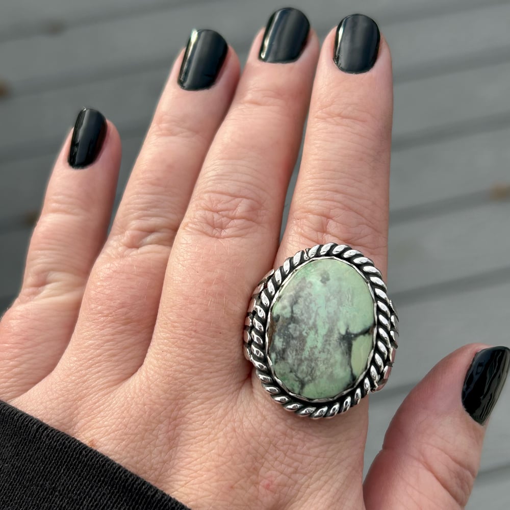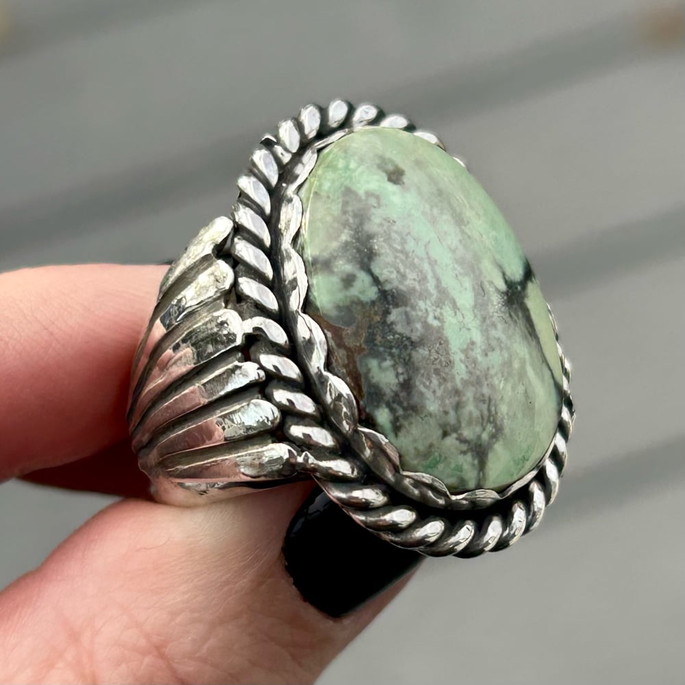 Gorgeous Damele Variscite set in handmade Sterling Silver ring. Details include a scalloped bezel, twist wire border, and fan detailing on the sides. Ring has a double split shank style band for comfort and wearability. Backplate is stamped with artist initials (my own) and ".925" for Sterling.