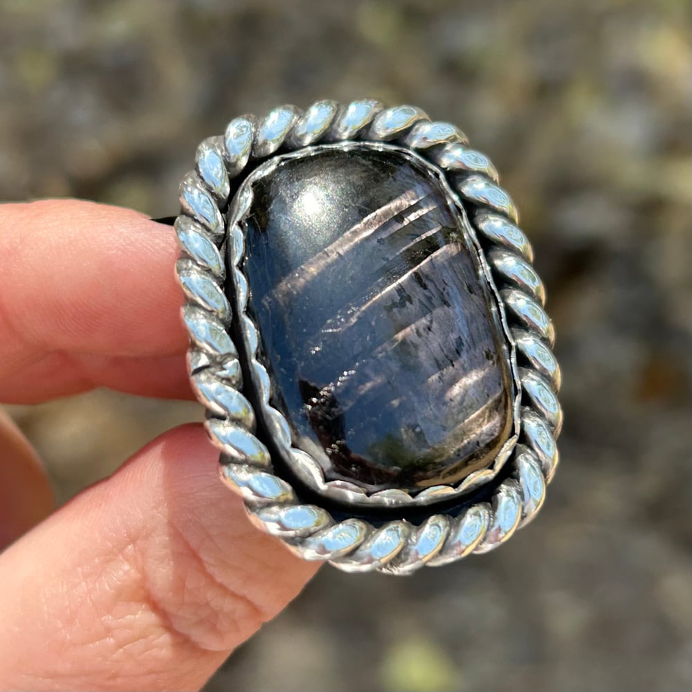 Bold, rectangular ring featuring a striking piece of Hypersthene! Details include a scalloped bezel and an extra thick twist wire border. Ring has a double split shank style band for comfort and wearability. Backplate is stamped with artist initials and “.925” for Sterling.