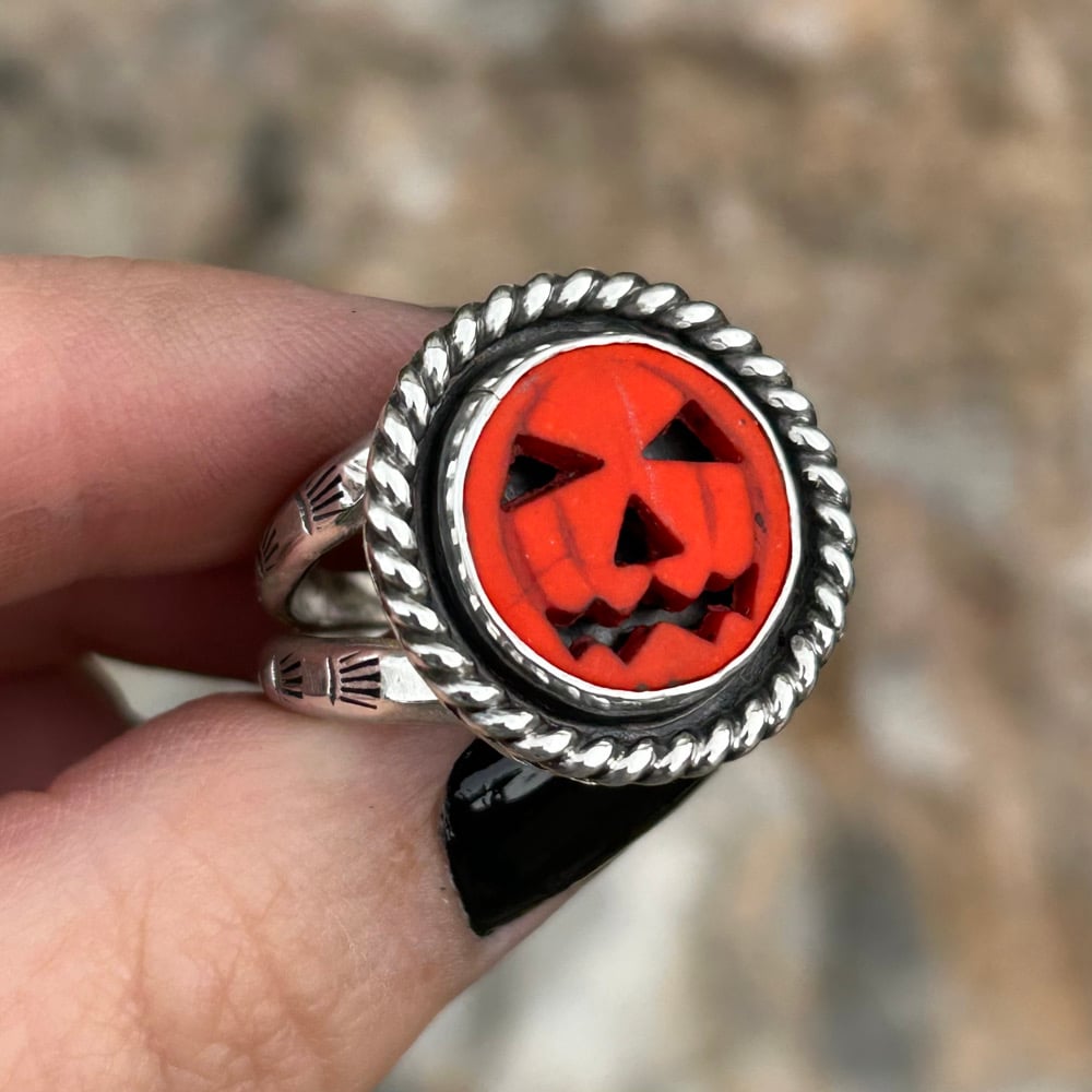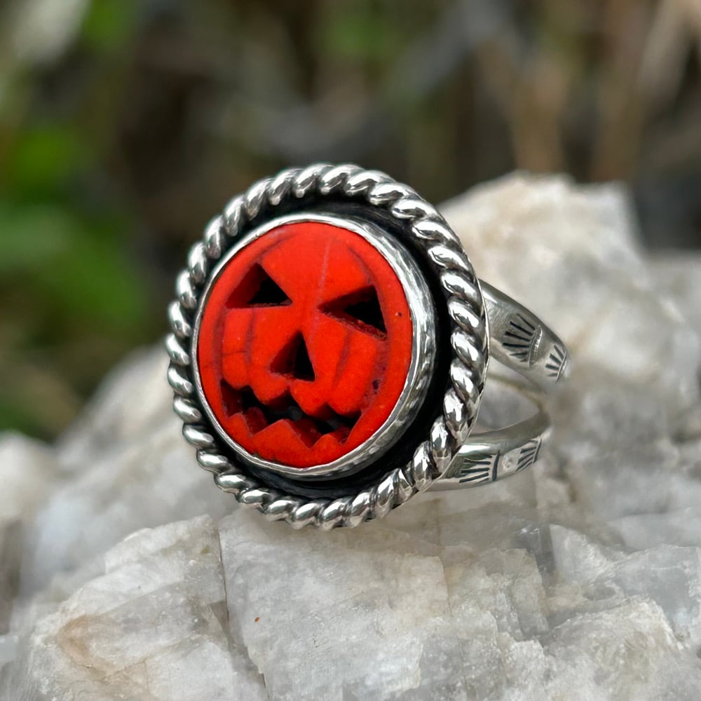 Bright orange classic Halloween Jack O Lantern set in handmade Sterling Silver ring. Details include a smooth bezel and a twist wire border. Ring has a stamped double split shank style band for comfort and wearability. Backplate is stamped with artist initials (my own) and “.925” for Sterling.