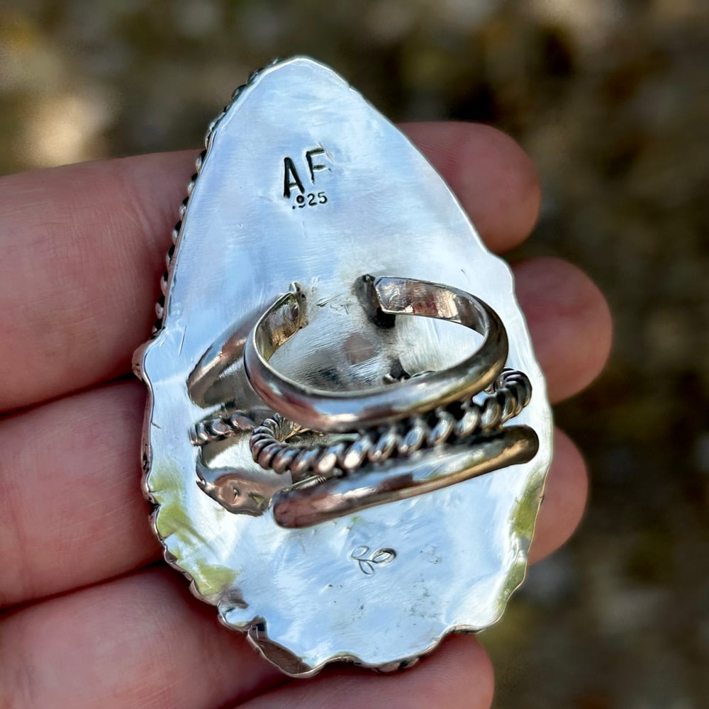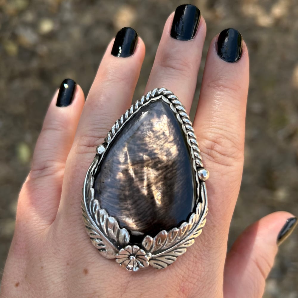 Gorgeous, dark and super unique. This XL & flashy statement ring is sure to draw attention! Details include a scalloped bezel, two large leaves/feathers, a flower, silver balls, and a twist wire border. Ring has a triple split shank style band (middle band is twist wire) for comfort and wearability. Backplate is stamped with artist initials (my own) and “.925” for Sterling.